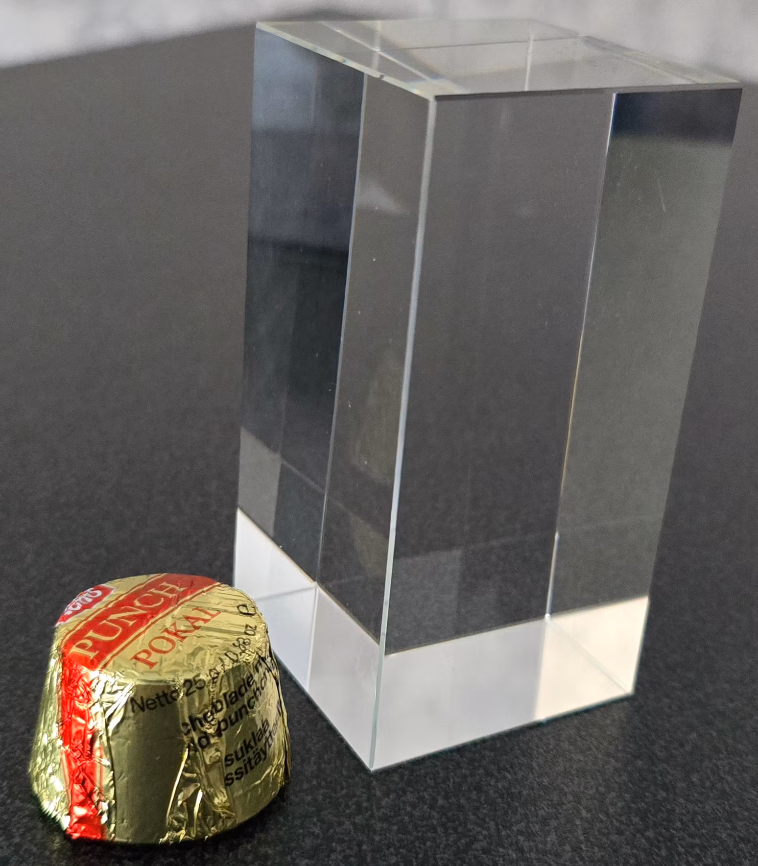 Ett elegant glasblock (50x50x100 mm) med lasergraverat foto inuti, som ger en vacker 3D-effekt.